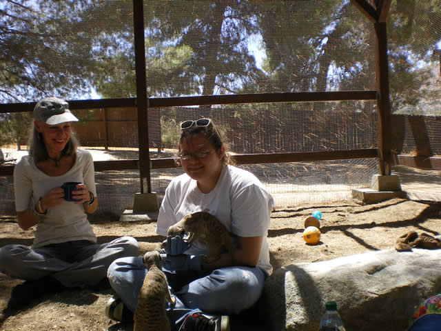 In August of 2006 our director, Pam, received a handwritten letter from Leah. She explained that, although she first learned about meerkats from the character of Timon in Disney’s The Lion King, she expanded her love of meerkats by watching Animal Planet’s Meerkat Manor for which Pam was the publicity spokesperson. As previously mentioned, our meerkat, “Kalahari,” was the model and inspiration for Timon. Pam and “Kalahari” were honored to work with 100 immensely talented animators on the movie.