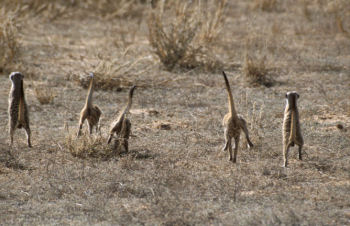 This journey, unlike my last visit to Africa, did not focus on habituated meerkats, but rather on gathering information for a book about the flora, fauna, and native people living in the meerkats' homeland. Thus, photographs of my favorite animals were literally of them "on the run" since these were truly wild mobs. Although it was a bit frustrating to not get close to the meerkats, it was gratifying to see these robust groups living out their lives as nature intended.