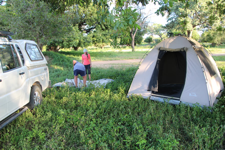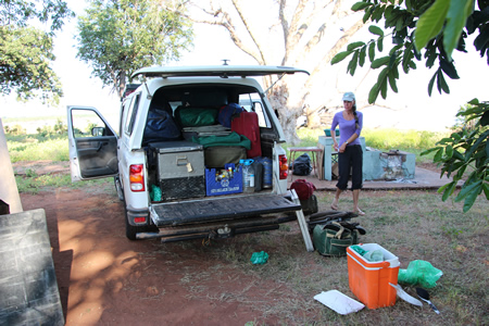 Pam Bennett-Wallberg packing camping gear in Zimbabwe.